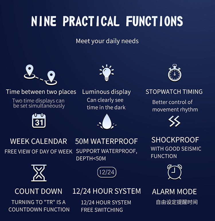 - Multi-Function Watch – Includes calendar, countdown timer, stopwatch, luminous display, alarm, and hourly chime.