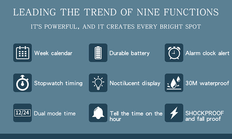 - ★Features ★: stopwatch, shockproof, LED display, automatic date display, weekly display, waterproof, backlight, chronograph, swimming, alarm, luminous