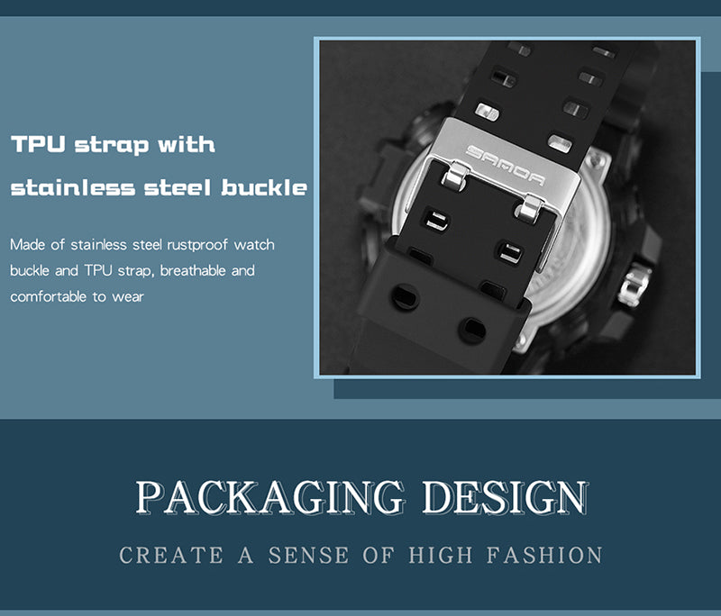 Stay ahead in style and performance with the SANDA-7800 Luxury Sports Watch, designed for men who demand both durability and fashion. With its dual display, shockproof build, and waterproof design, this multi-function sports watch is perfect for swimming, outdoor adventures, and everyday wear.